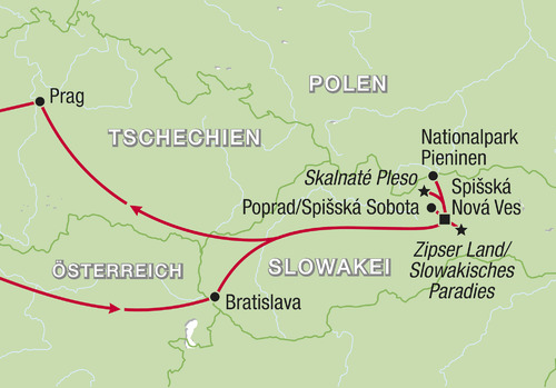 Majestätisch erheben sich die Gipfel der Hohen Tatra, der höchsten Erhebung der Karpaten, über das grüne Herz der Slowakei. Diese Reise führt Sie in eine der schönsten und ursprünglichsten Bergregionen Mitteleuropas. Umgeben von klaren Seen, tiefen Wäldern und spektakulären Panoramen erleben Sie echte Naturschönheiten – aber auch kulturelle Glanzlichter. Denn neben der beeindruckenden Tatra-Region besuchen Sie zwei europäische Metropolen – die beiden lebendigen und zugleich geschichtsträchtigen Hauptstädte Bratislava und Prag. Eine abwechslungsreiche Reise für Naturfreunde, Genießer und Entdecker!